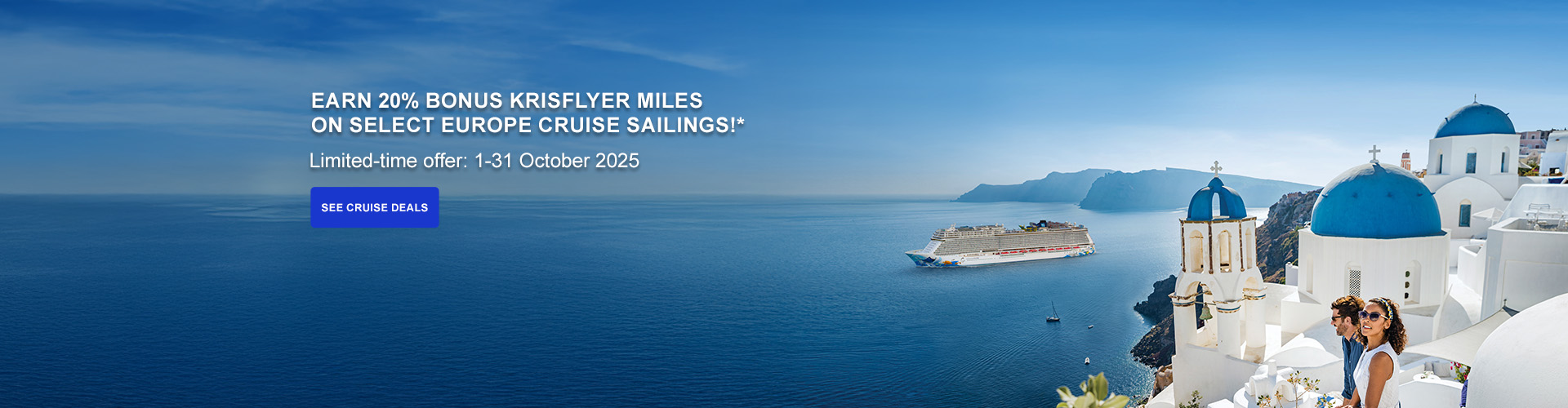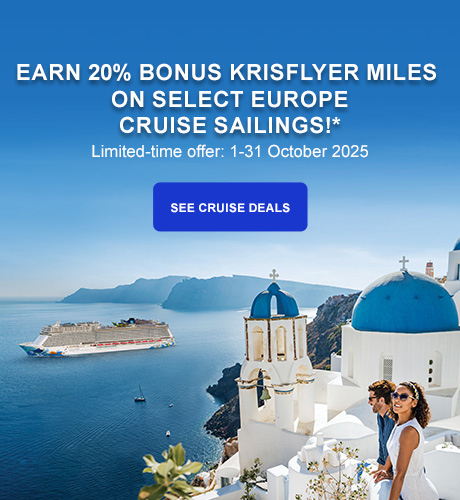 Set sail with KrisFlyer Cruise and earn 2 KrisFlyer miles for every USD 1 spent on your cruise fare when you book through KirsFlyer Cruise, on top of a range of featured deals and special offers.